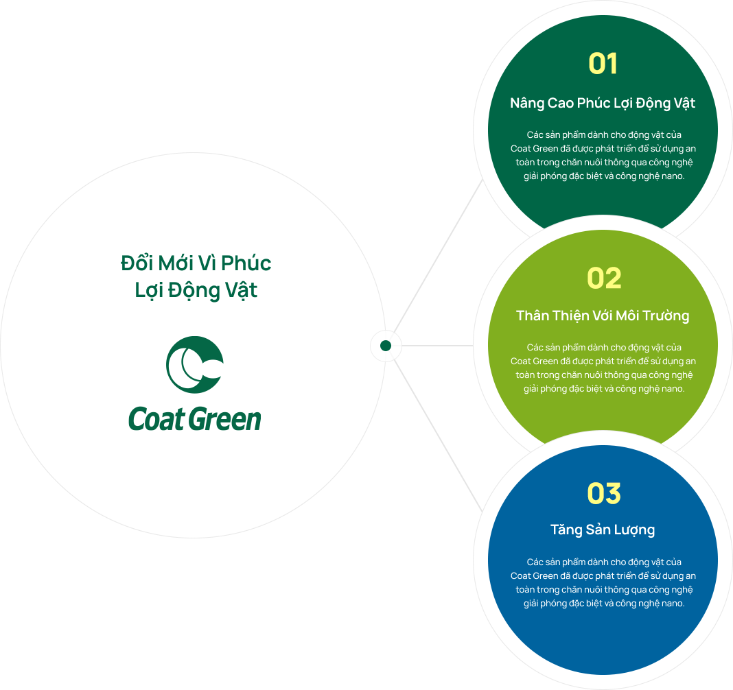 Các sản phẩm sử dụng công nghệ vi sinh vật đã được phát triển để ức chế các vi sinh vật gây mùi hôi từ vật nuôi, cho phép vật nuôi sống trong môi trường sạch sẽ và dễ chịu. Thức ăn chăn nuôi của CoatGreen giảm hiệu quả khí thải amoniac từ vật nuôi để cải thiện môi trường chuồng trại, và góp phần thực hiện phúc lợi động vật bằng cách giảm căng thẳng cho vật nuôi.